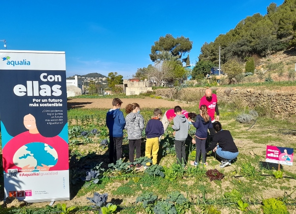 Imagen de la web aqualiaigualdad.com y otra fotografía de un grupo de escolares del CEIP Pare Pere de Jesús Pobre (Alicante) durante la jornada “plántate por ellas”, impulsada por Aqualia y en la que participó el concejal de Igualdad de Dénia, Javier Scotto.